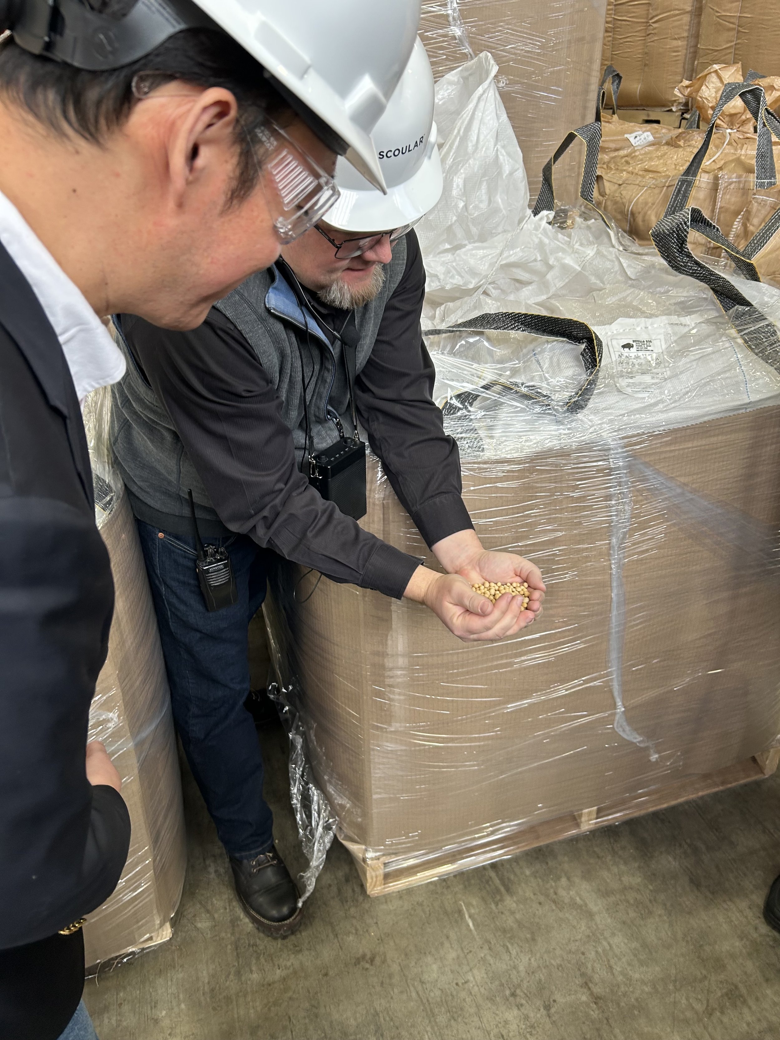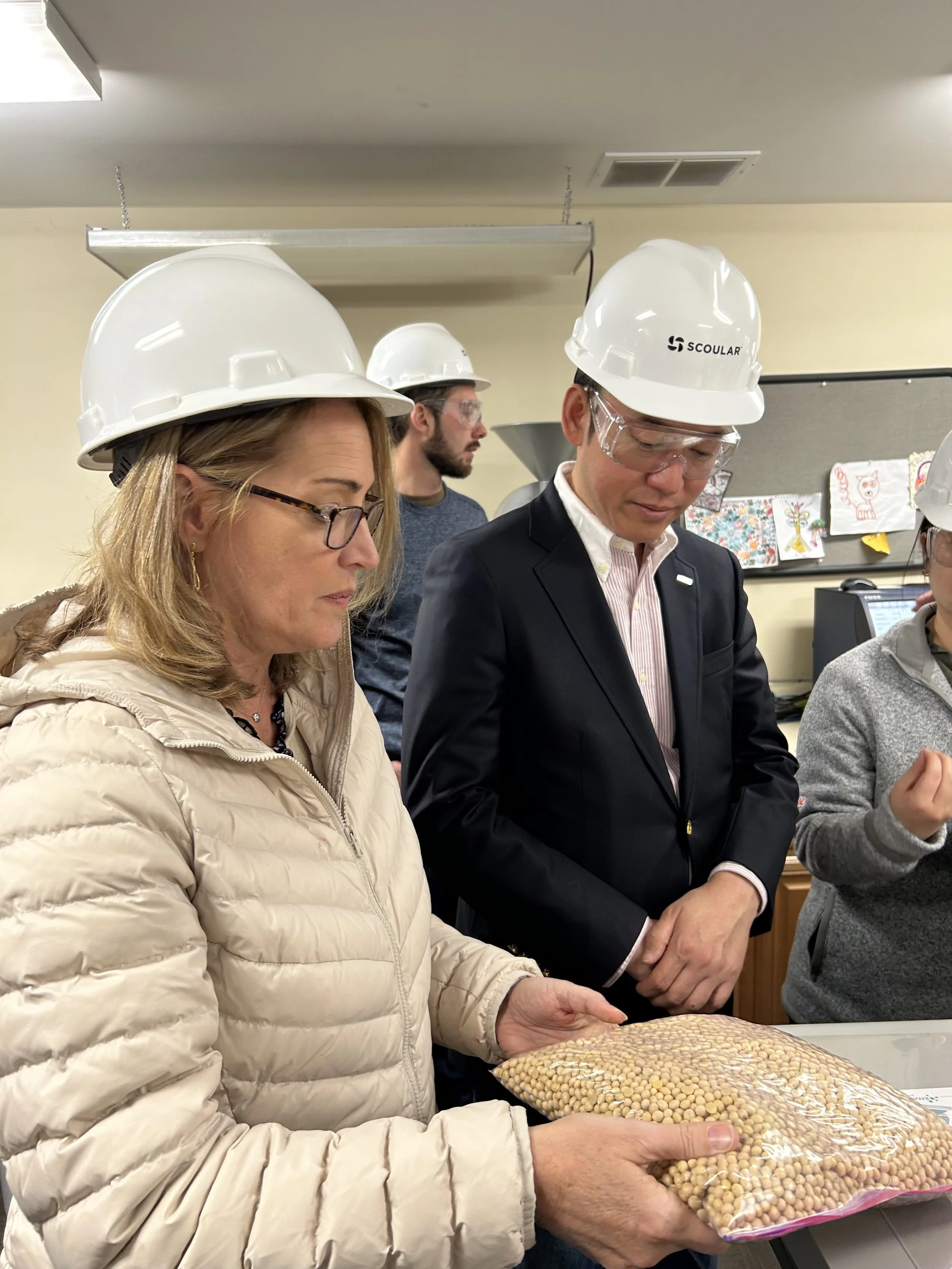The visit was held at the Scoular facility that processes only non-GMO and organic soybeans, cleaning, testing, and sorting before they are used for tofu production. The Scoular facility plays an important role in supplying House Foods with uniform, and clean soybeans that meet our quality standards.